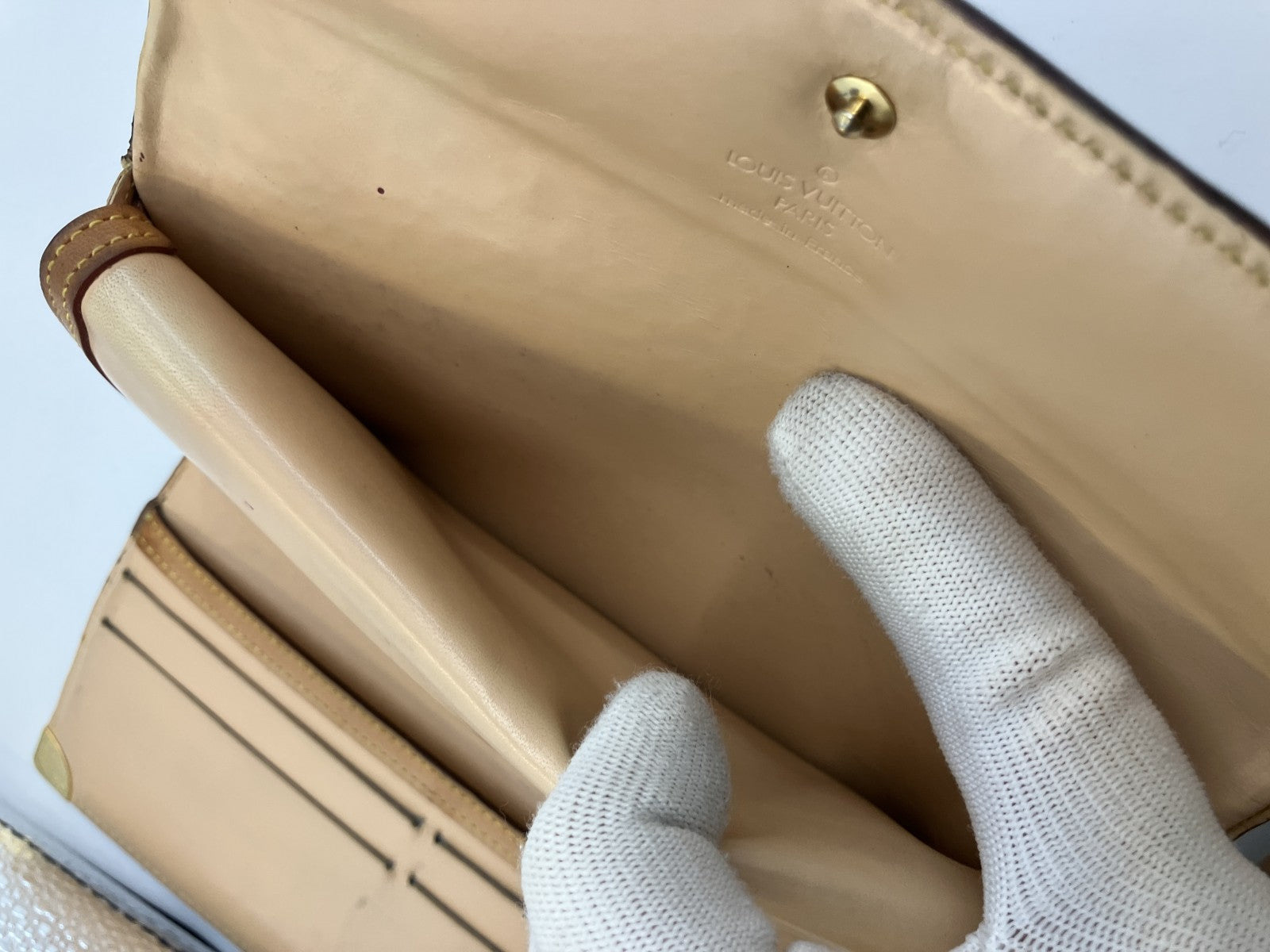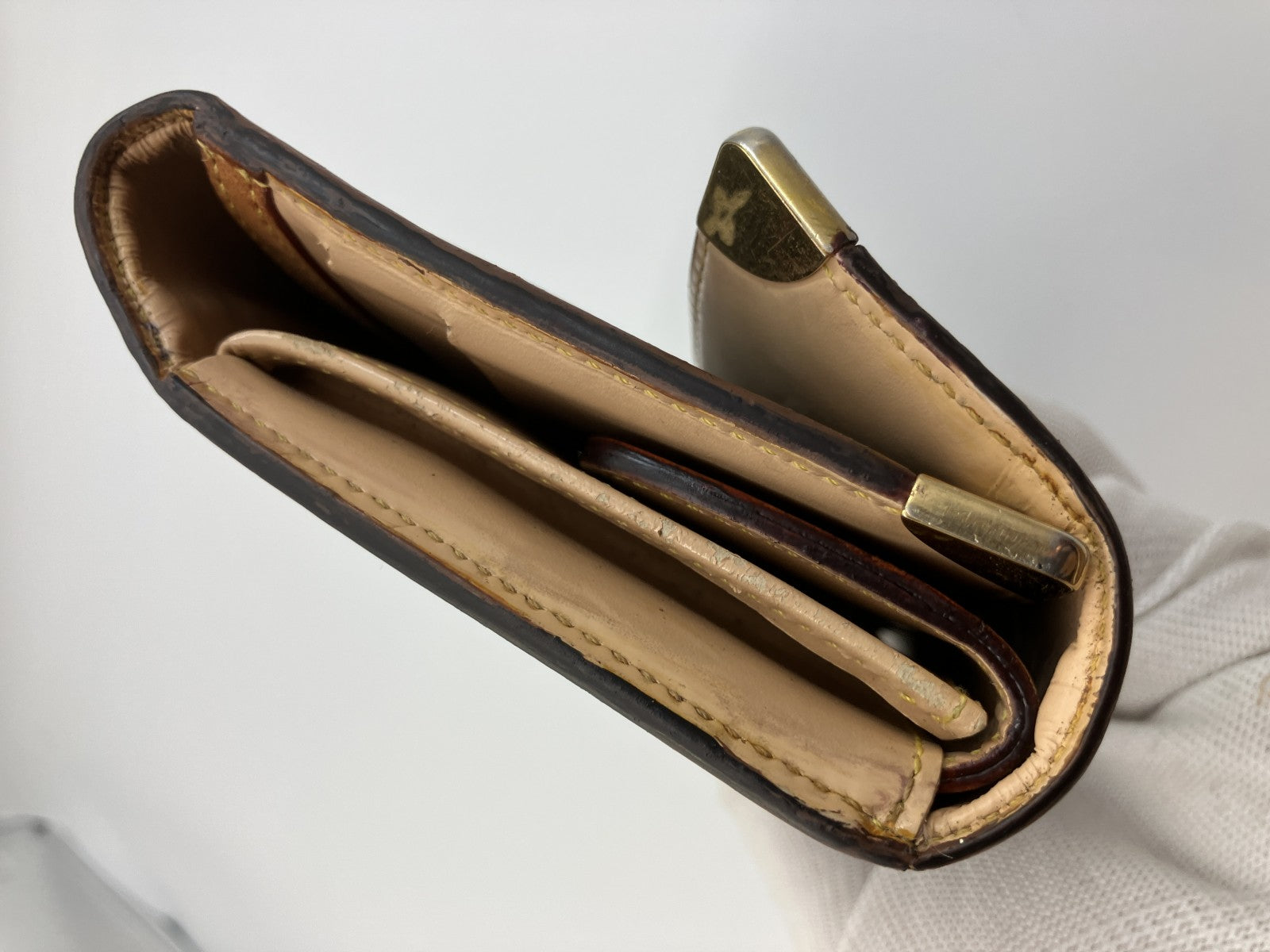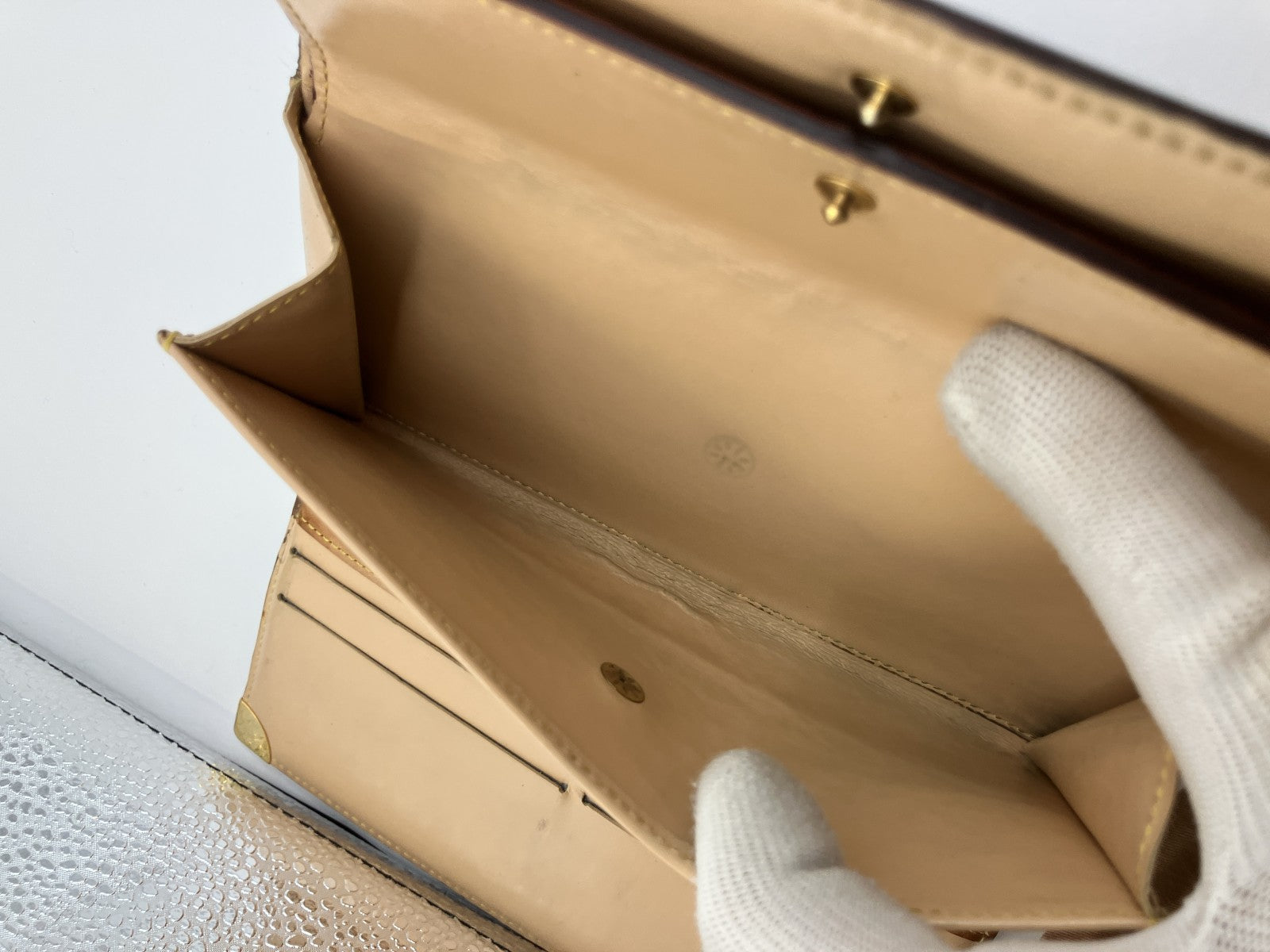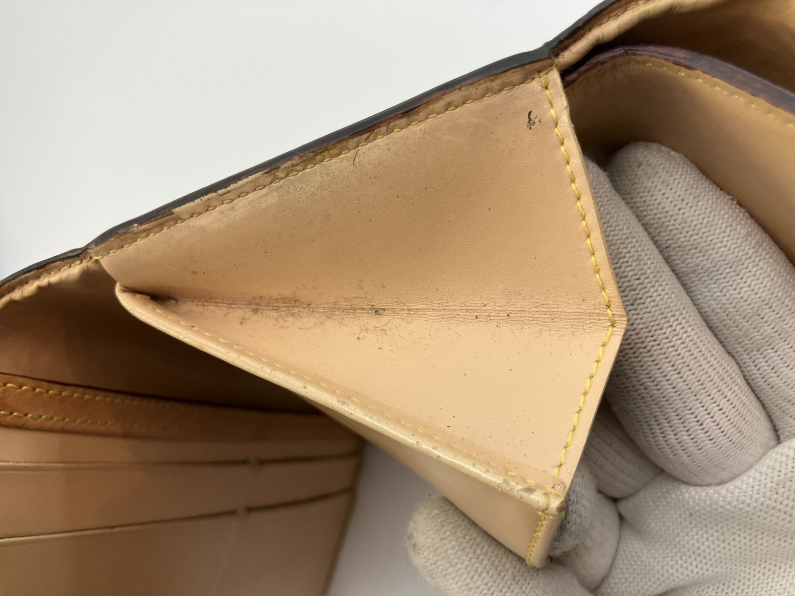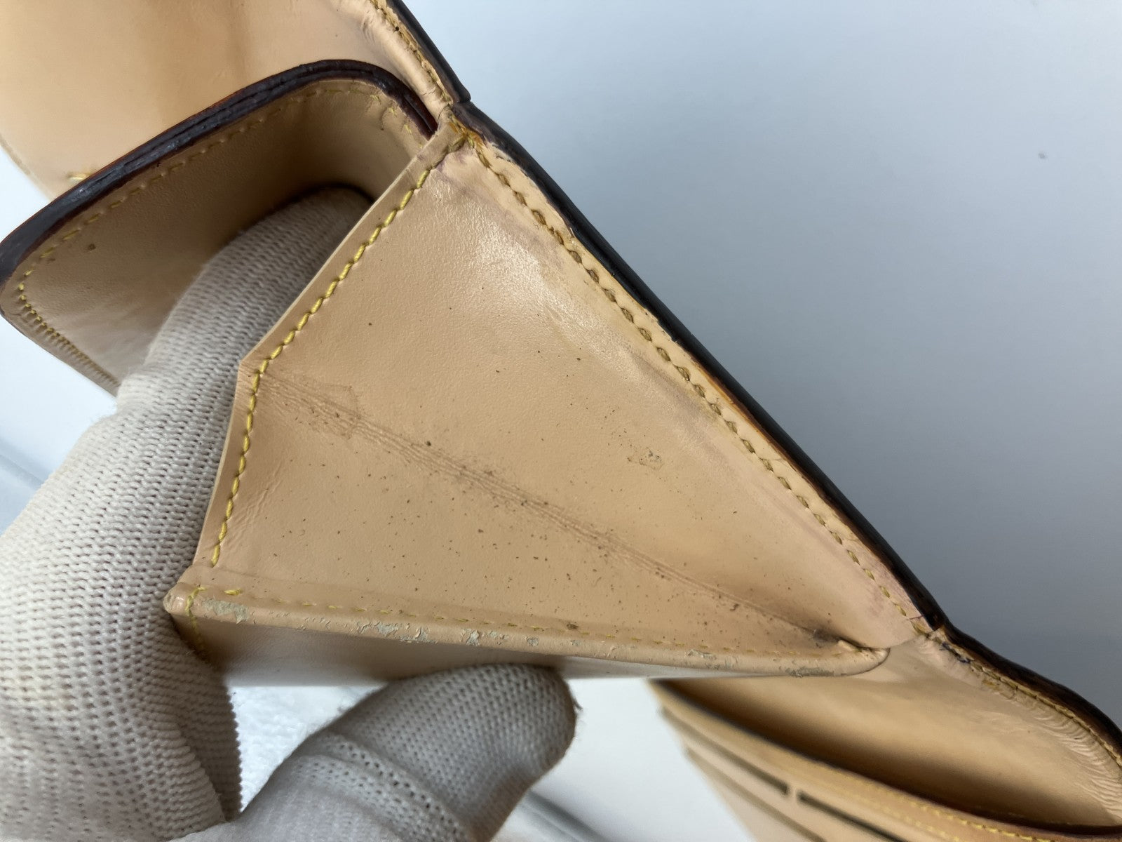 | Condition Details | Pre-owned. Noticeable wear overall: scuffs, scratches, stains, plating wear on metal corners, darkening and edge glazing touch-up on leather piping. Interior has marks/lines. No major structural damage and still usable. Please check all photos. |