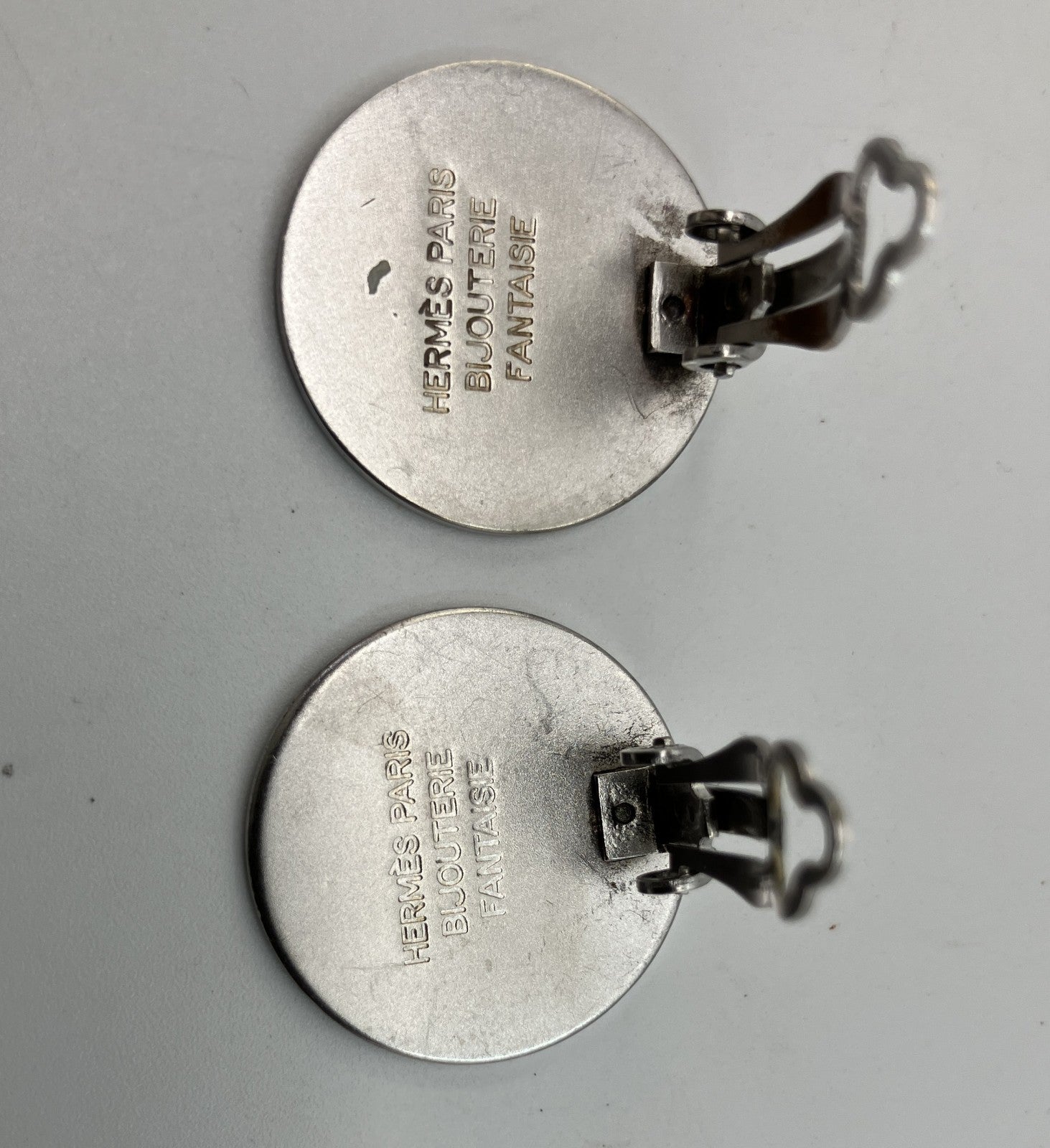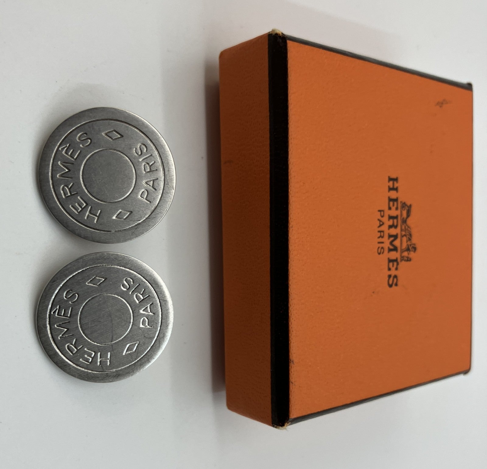 | Condition Details | These vintage HERMES clip-on earrings show small scratches, fine surface wear, and minor signs of use on the clip mechanisms. The clips open and close properly with no functional issues. No major damage. Comes as a pair, and includes the original orange HERMES box. |