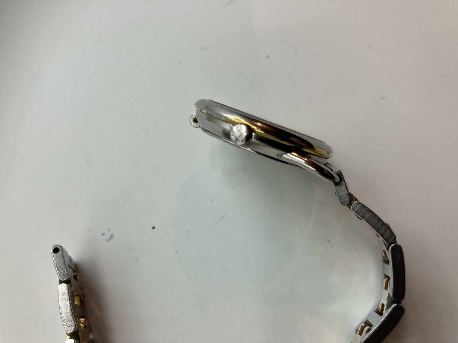 バンド部のネジが欠損しています。 (穴ネジは問題ありません。確認済み) バンド部盛り上がってます。 メッキ販売あります。 その他小傷あります。 時計は普通に動いてます。 |