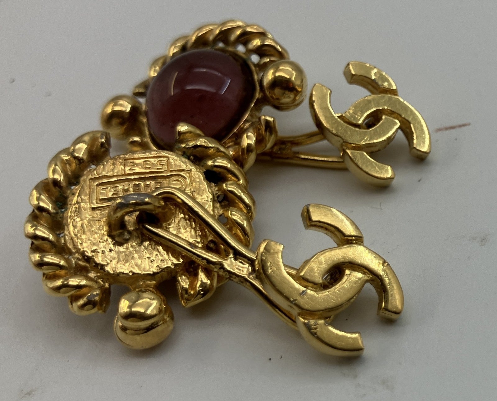 Authentic vintage CHANEL costume cufflinks featuring the CC logo and pink cabochon-style stones in a gold-tone setting.