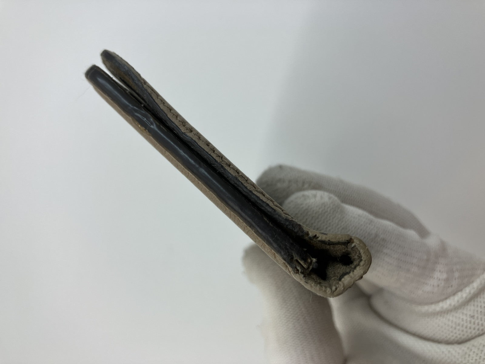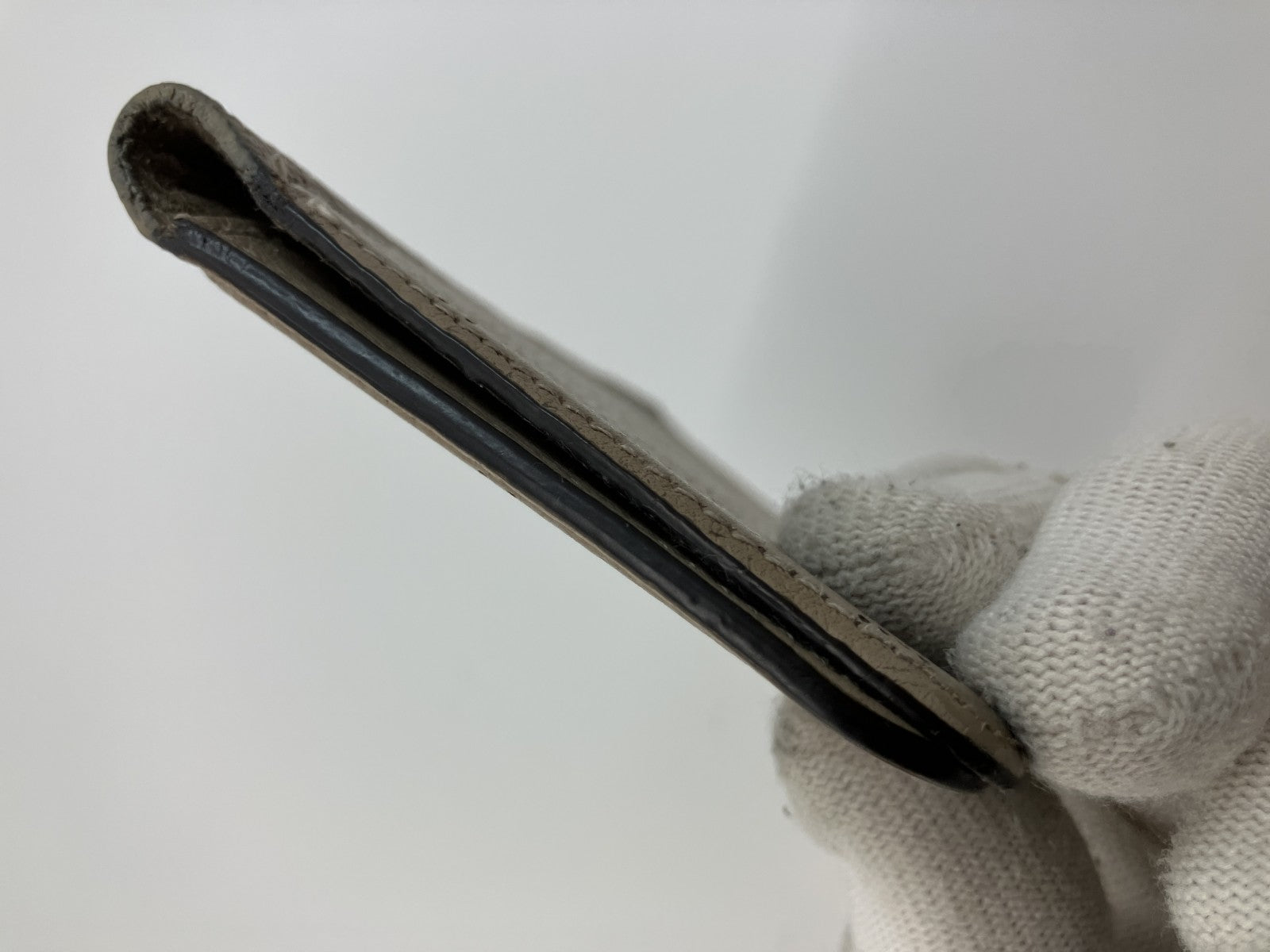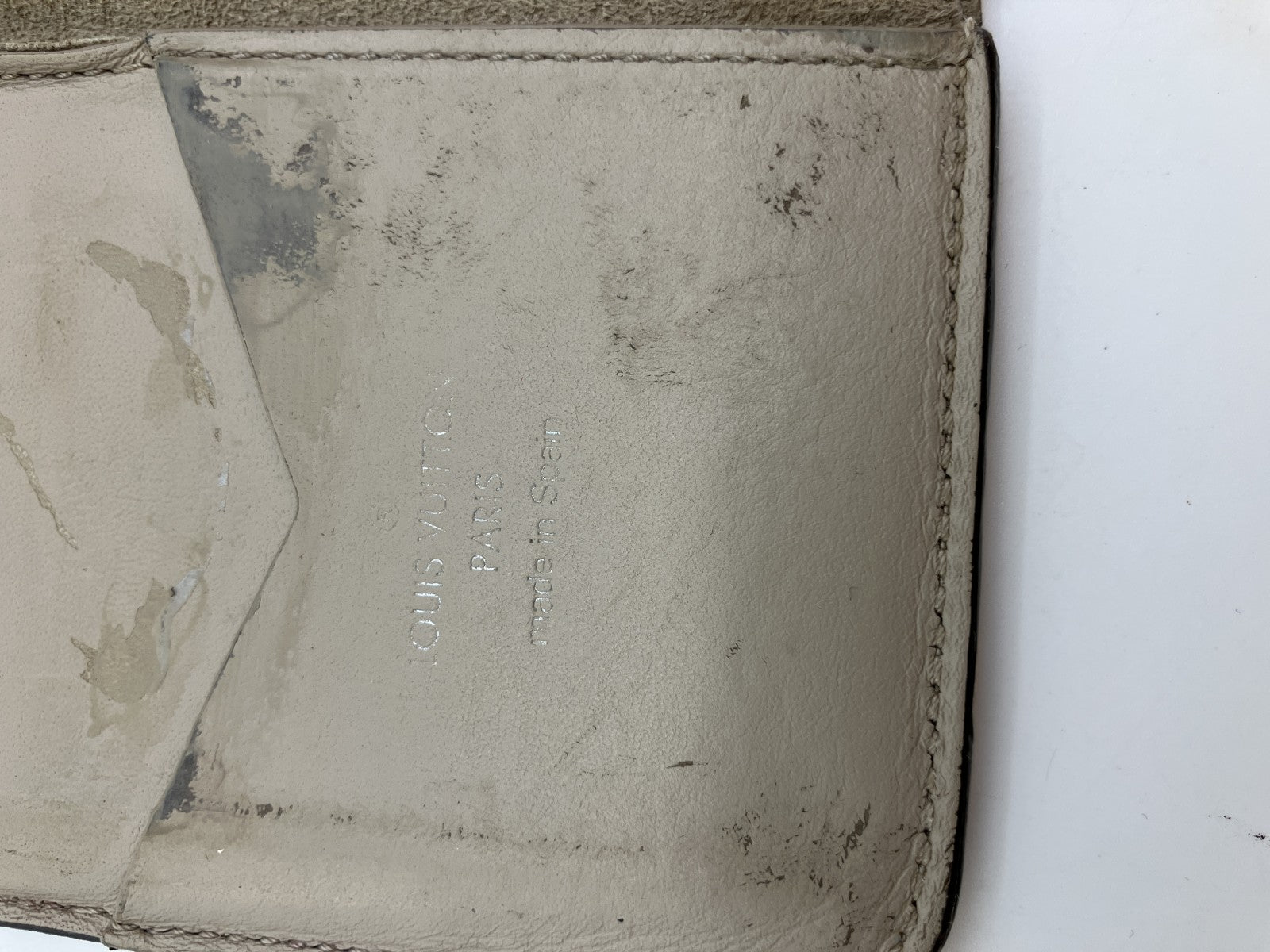 Pre-owned with heavy signs of use. Overall scuffs, dirt/stains, edge wear, shape loss/warping. Dark marks and peeling/adhesive residue inside card area; abrasions around camera opening and edges; lining wear on hinge. Still usable. Please review all photos carefully.