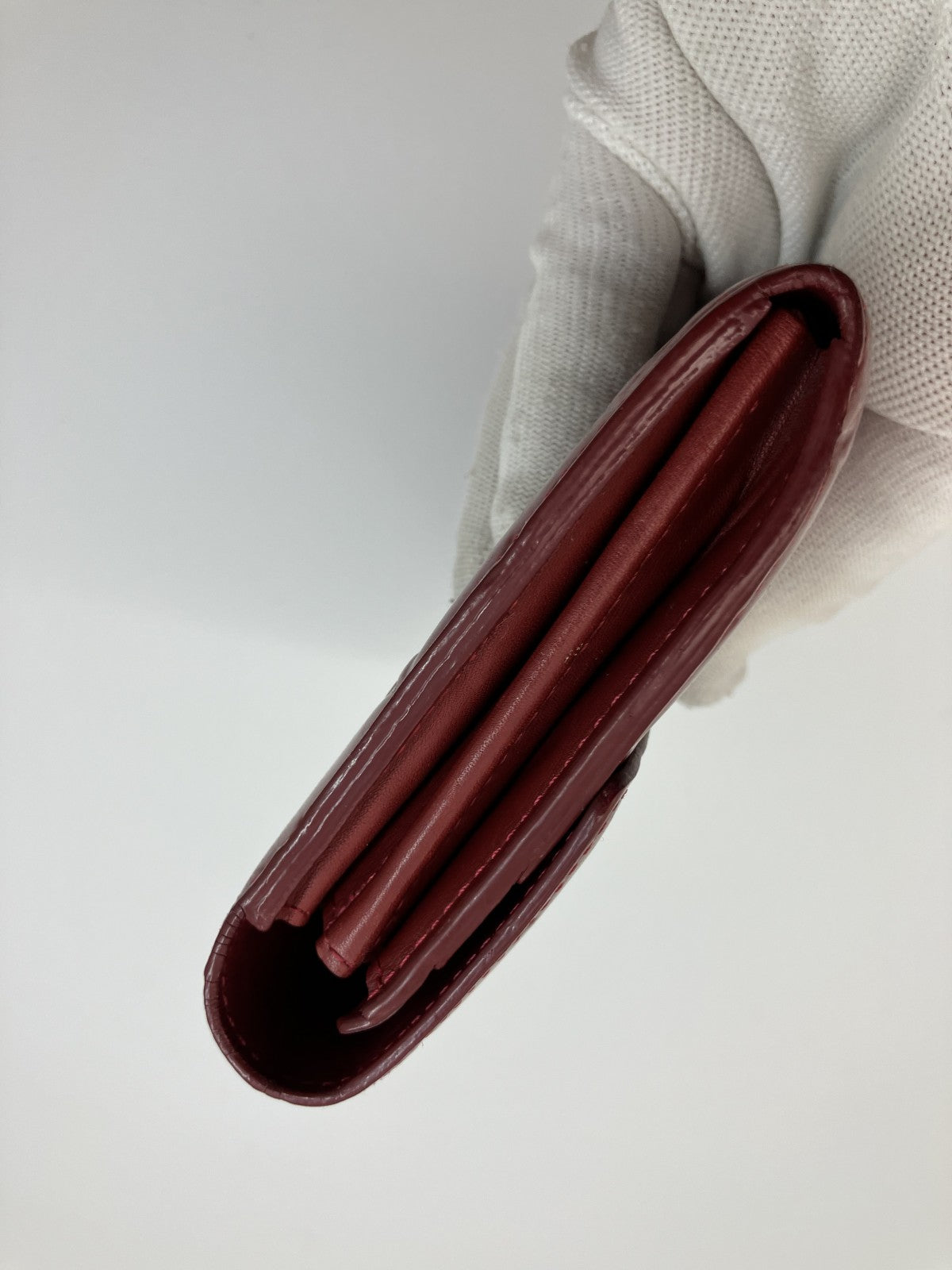 | Condition Details | Pre-owned with wear. Vernis patent exterior shows small scratches, rubs, press marks and creasing along the fold; edges have mild rubbing; hardware has scratches and plating wear. Interior leather shows use; one card slot section has tears (see close-up photo). Coin pocket and bill compartments show general use. Fully functional overall. Please review all photos. |