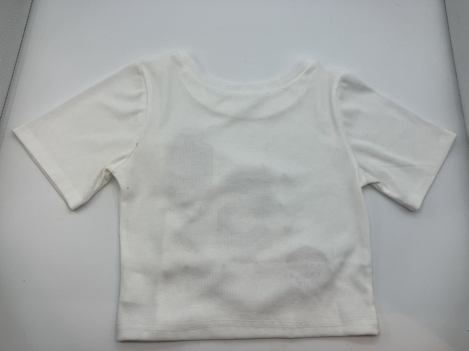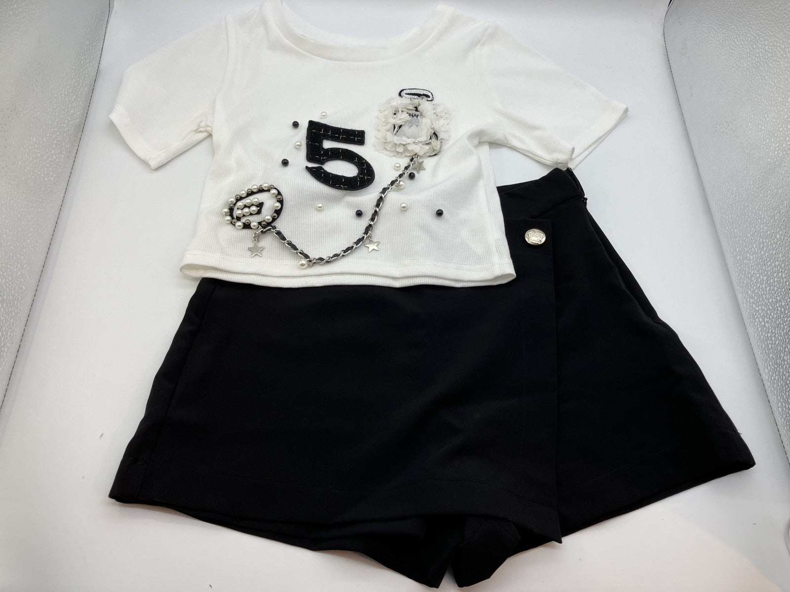 [Good condition / Model wearing image included] Cropped T-shirt & wrap-style skirt pants set / Short-sleeved bejeweled top + short-pants-style skirt / Korean-style outfit /