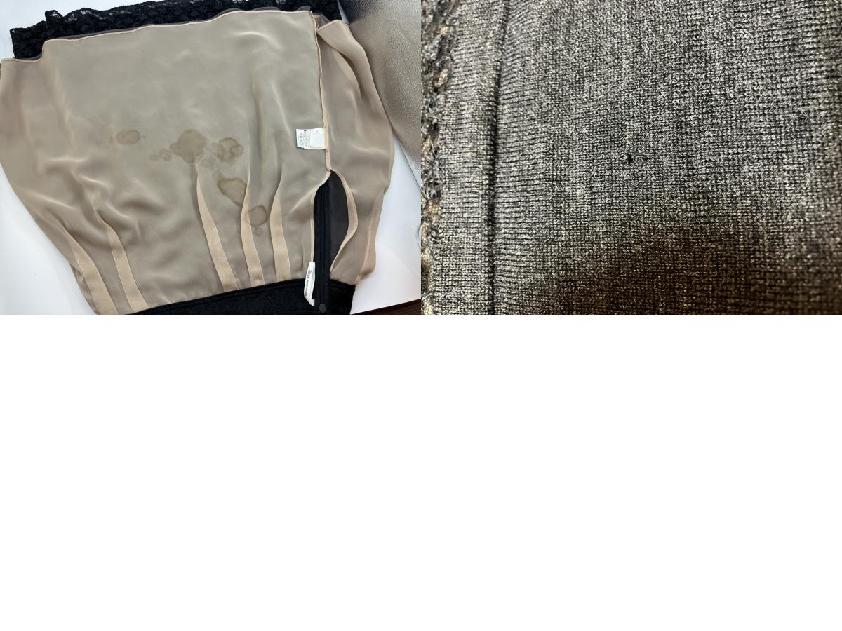 | Condition Details | Light wear and fuzziness overall Small fray at back lower center of top (see photo) Tear on inner tag Stains on skirt lining (see last photo) |