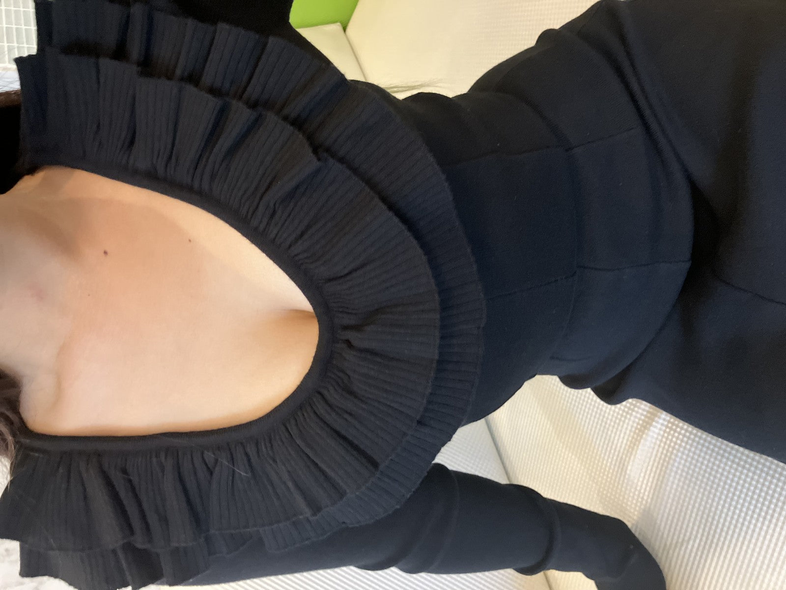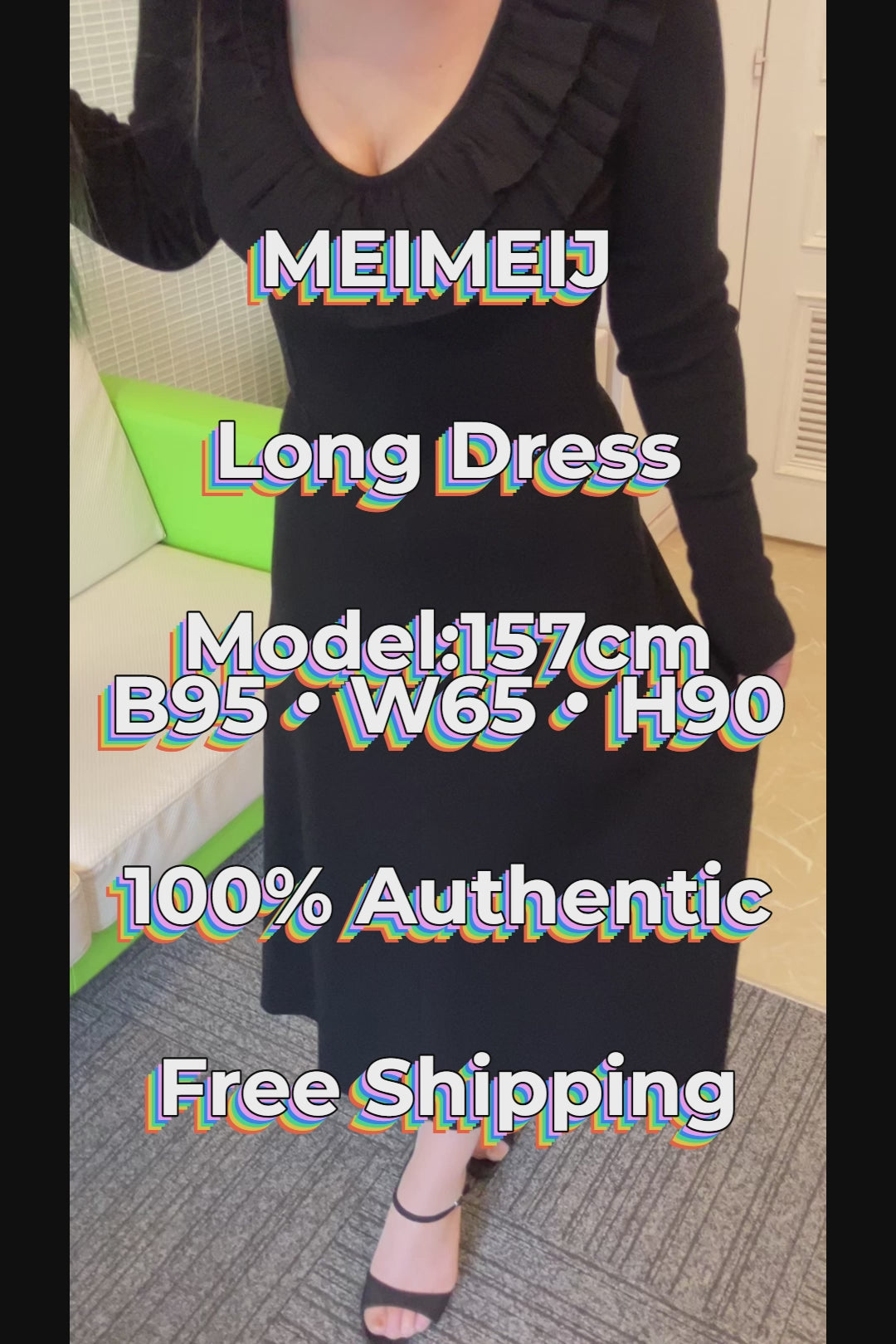 MEIMEIJ Long Black Dress TG36 Made in Italy 窶・Elegant Ruffle Neckline 窶・Stretch Comfort 窶・