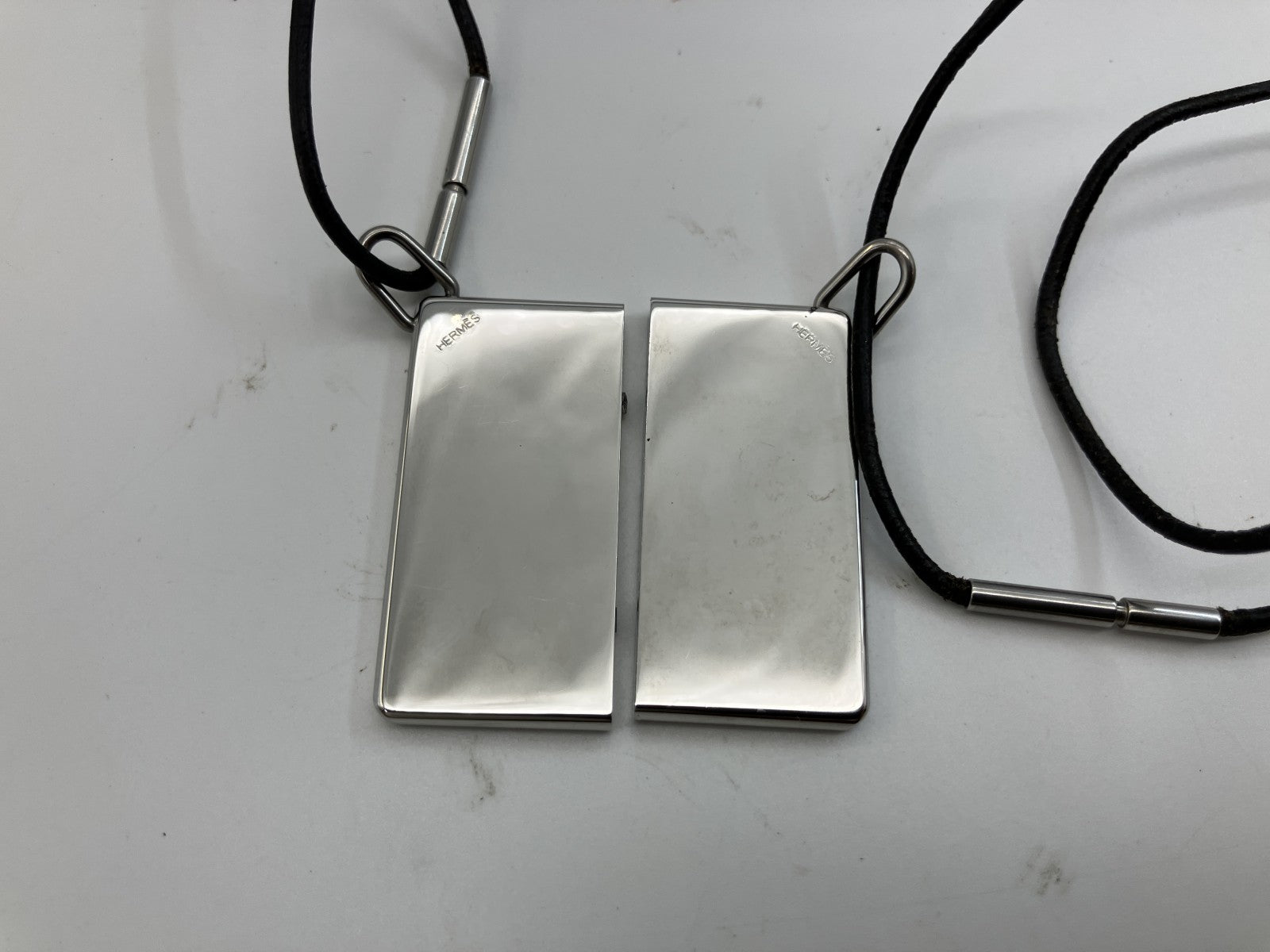 HERMES Symbol Pair Necklace 2000 Silver-Tone Metal Top 4×2cm Black Leather Cord with Box
