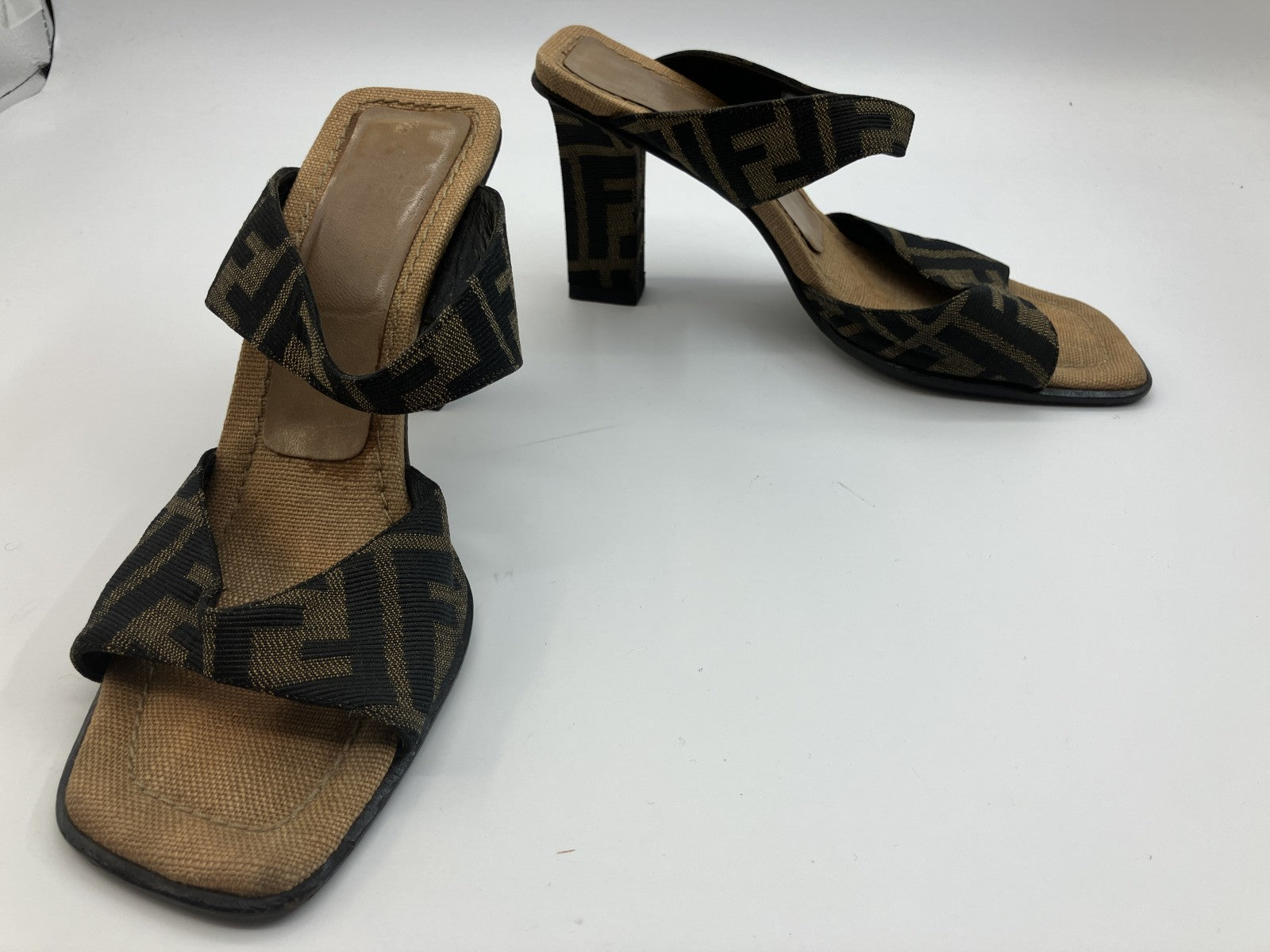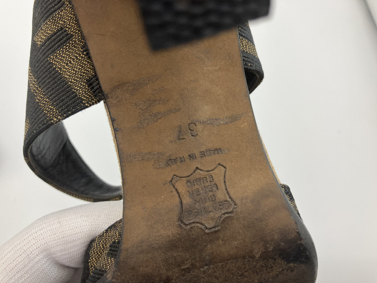 FENDI Zucca Canvas Sandals Block Heel EU 37 US 6.5–7 Brown Black Repaired Heel